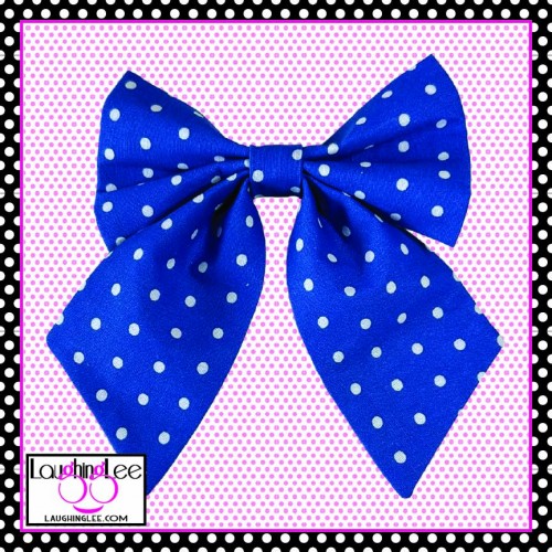 This lovely Sailor Bow (bowtie with tails) has white polka dots on a medium blue background. This is the same coordinating fabric we use in all our Blue Puppy Party products.