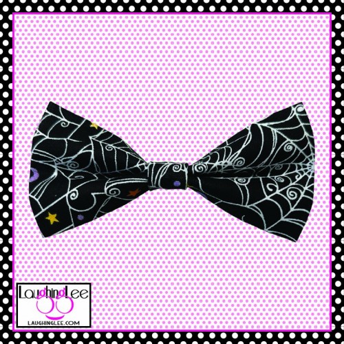 This spook-tacular bow tie features lacy spider webs with orange, yellow, and purple accents on a black background. This is the same fabric we use in all of our Spider Webs products.