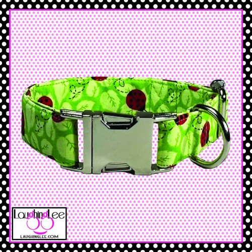 This is an adorable pet collar that has a plethora of fat and happy ladybugs on a bed of leaves over a light green background. This is the same fabric we use in all of our More Ladybug Fun products.