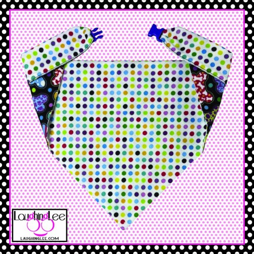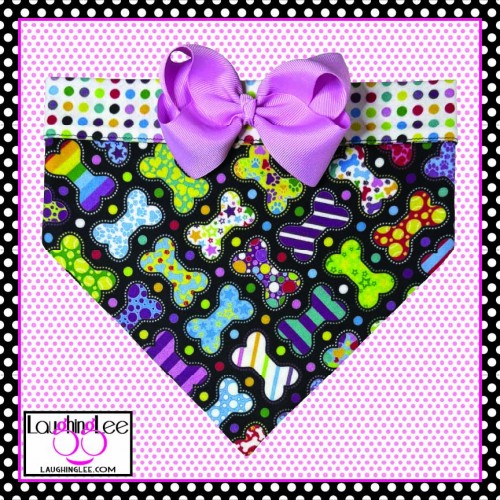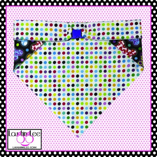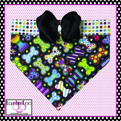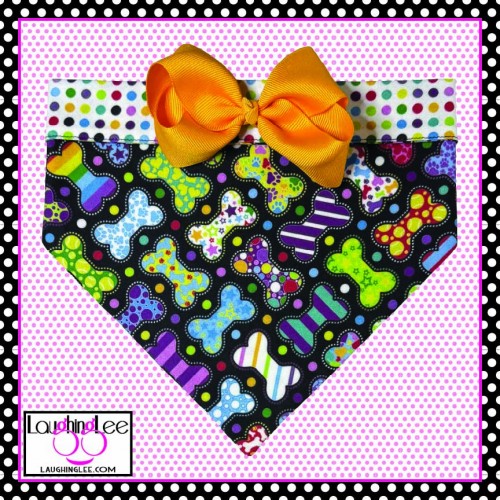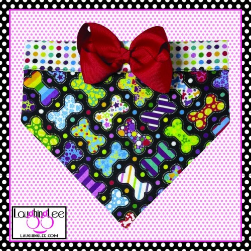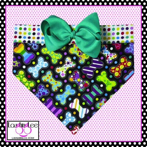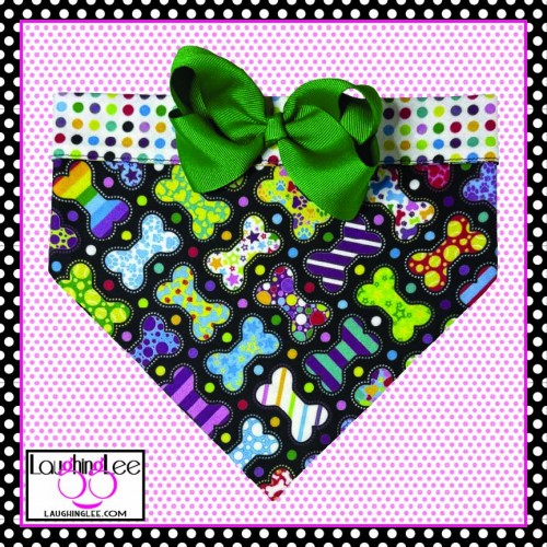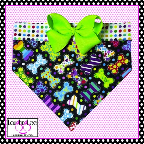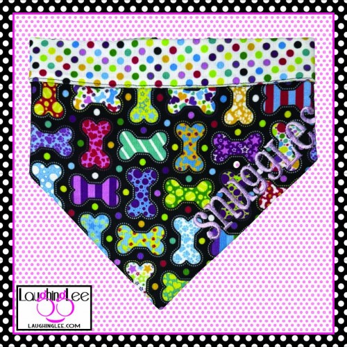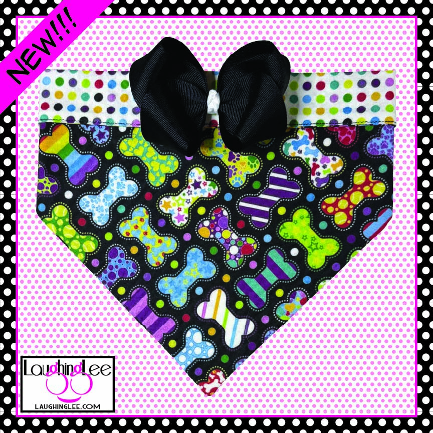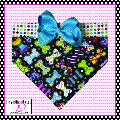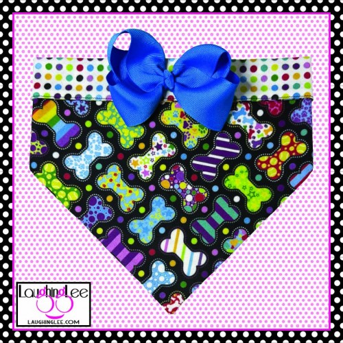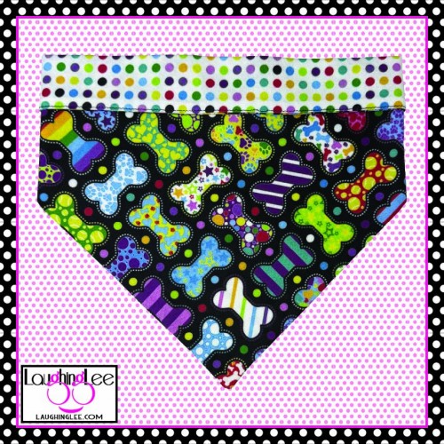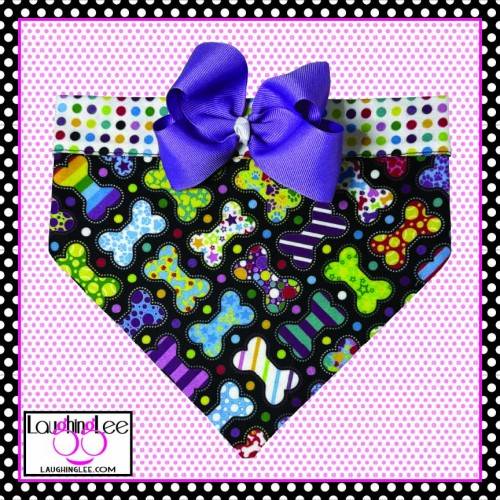 The fabrics used in these adorable Bone Appetreats pet accessories were personally designed by Lee! The main fabric has a plethora of adorably decorated and colorful bones in a criss-cross pattern on a black background. She paired that with colorful polka dots on a white background that she calls Skittle Dots. All of the colors in both fabrics match perfectly as Lee used the same pallette of colors for both. The fabrics are simply delightful, and will look even better on your pet.