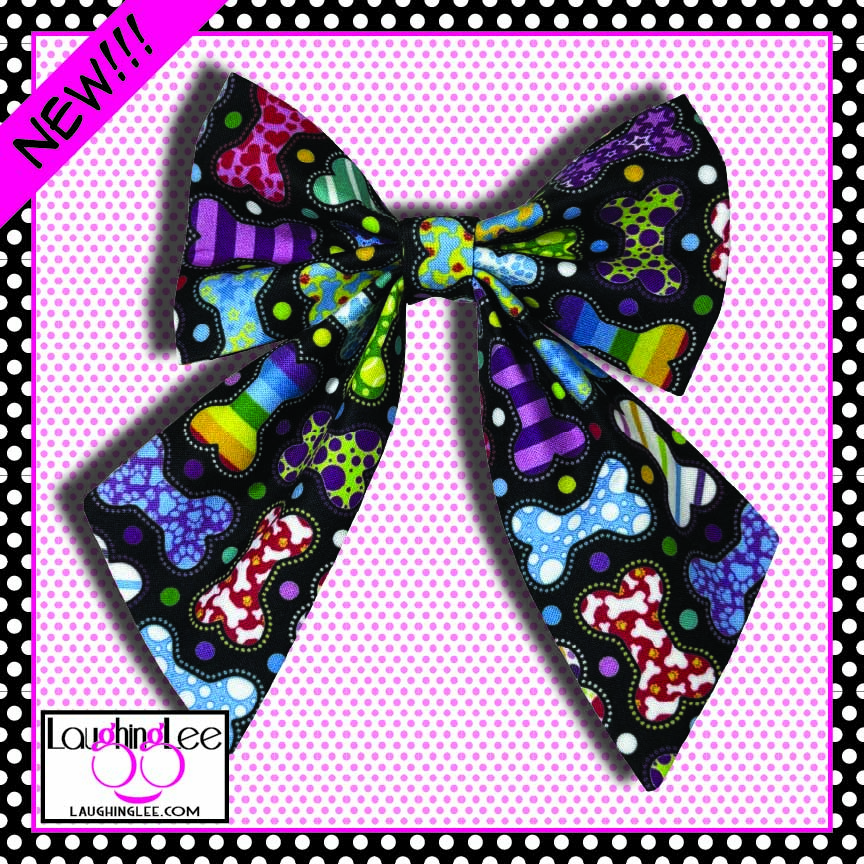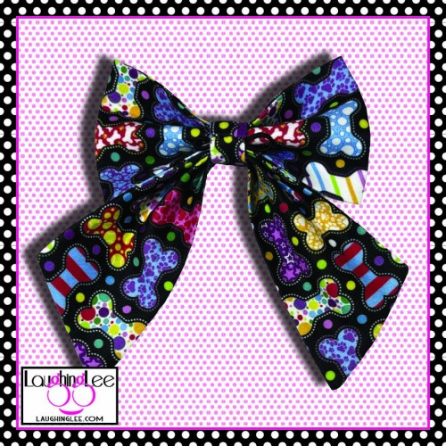 These sailor bows are done in the same fabric used in all of our Bone Appetreats pet accessorites, It sports a plethora of colorfully designed dog bones in a criss-cross pattern. The dog bones are on a black background, that makes a delightful sailor bow that will look fabulous on your pet.